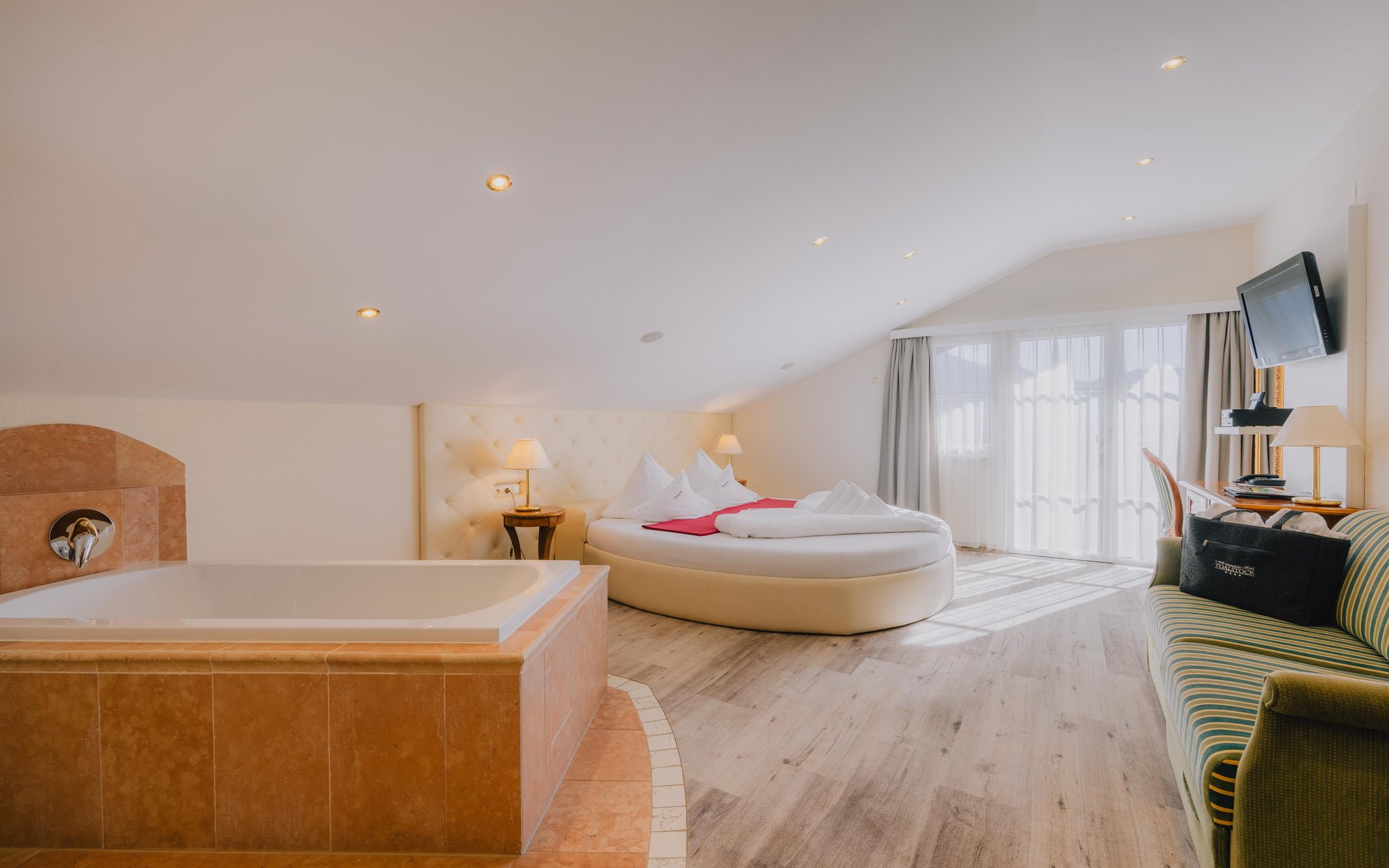 Das runde Himmelbett, die offene Badewanne und eine traumhafte Aussicht schenken Ihnen luxuriöse Augenblicke.